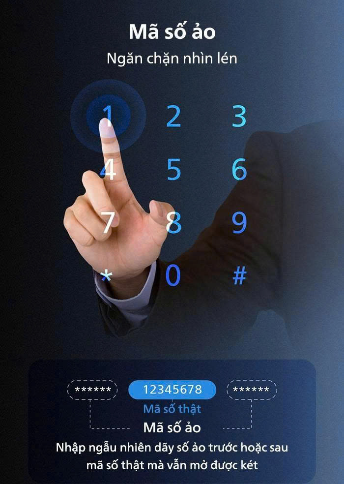 Người dùng có thể thiết lập Mã số cá nhân linh hoạt với độ dài tùy chỉnh. Điểm nổi bật là Chức năng Mã số ảo chống nhìn lén. Khi nhập mã số thật, bạn có thể thêm các dãy số ngẫu nhiên vào trước hoặc sau mã số chính. Hệ thống sẽ vẫn nhận diện và mở khóa nếu dãy số thật nằm trong chuỗi ký tự bạn nhập, giúp ngăn chặn tuyệt đối việc người lạ nhìn trộm hoặc ghi nhớ mật khẩu của bạn.