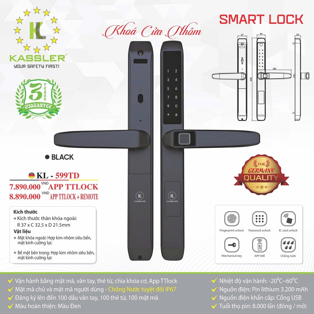 Khóa cửa nhôm Kassler KL-599TD Black App TTlock, Remote