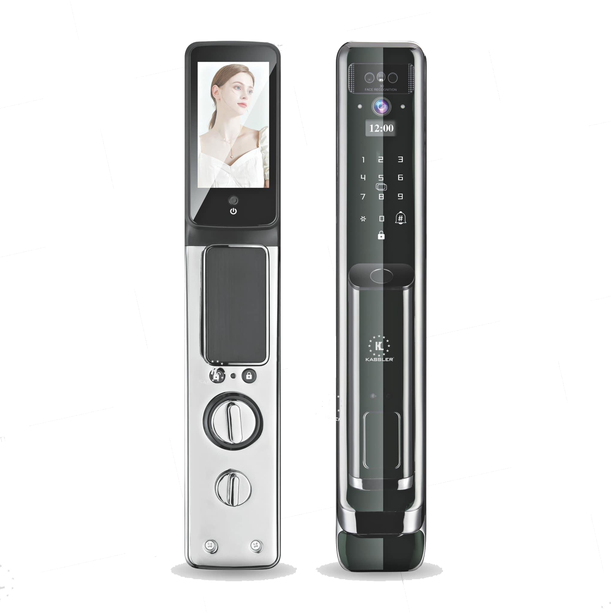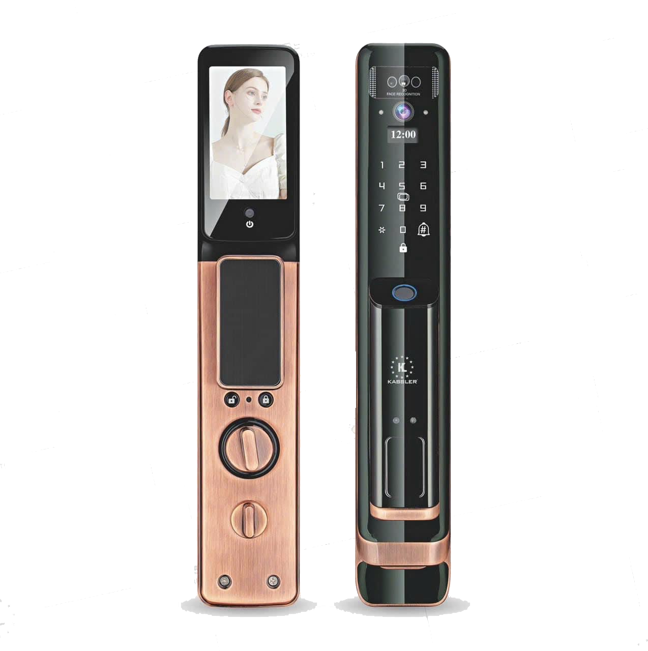 Khóa cửa thông minh có camera là dòng khóa hiện đại được tích hợp công nghệ, tính năng có thể mở khóa bằng vân tay và Face ID,… Các mẫu khóa này có thiết kế đầu đọc vân tay, camera, chuông hình hiển thị bên trong. Khi quét mã kết nối cùng bộ xử lý bên trong khóa để lưu giữ thông tin của chủ nhà. Khi mở cửa thì khóa sẽ quét mẫu vân tay và nhận diện khuôn mặt. Sau đó đối chiếu với dữ liệu đã được nhập trong đầu dọc.