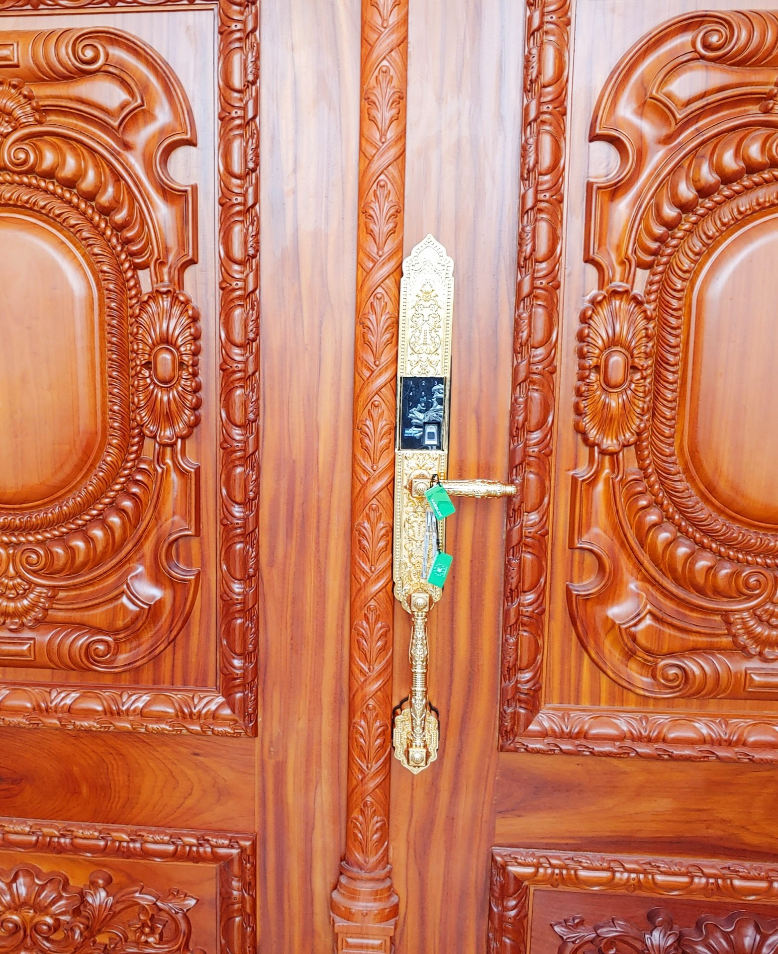 3. Hình ảnh lắp khóa điện tử lên cửa gỗ đại sảnh và cửa gỗ tân cổ điển: