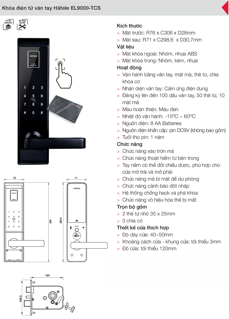 - Đăng ký lên đến 100 vân tay, 50 thẻ từ, 10 mật mã