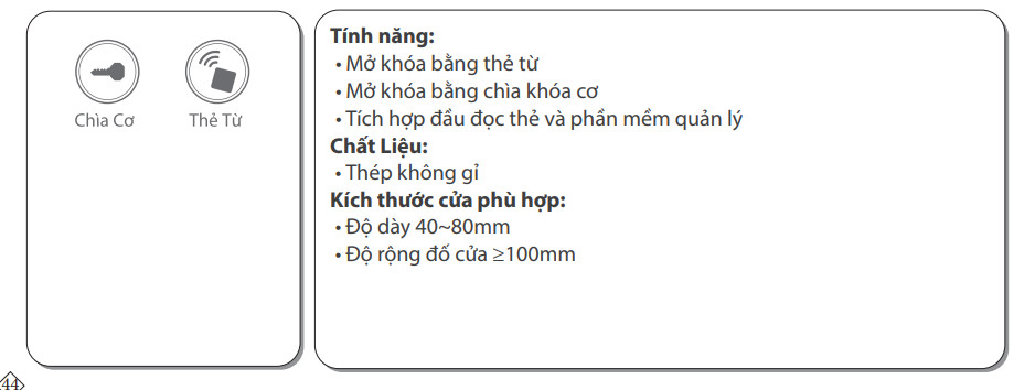 - Dễ dàng sử dụng: cửa sẽ tự động mở sau 1s kể khi thẻ được quẹt vào ô từ trên bề mặt khóa.