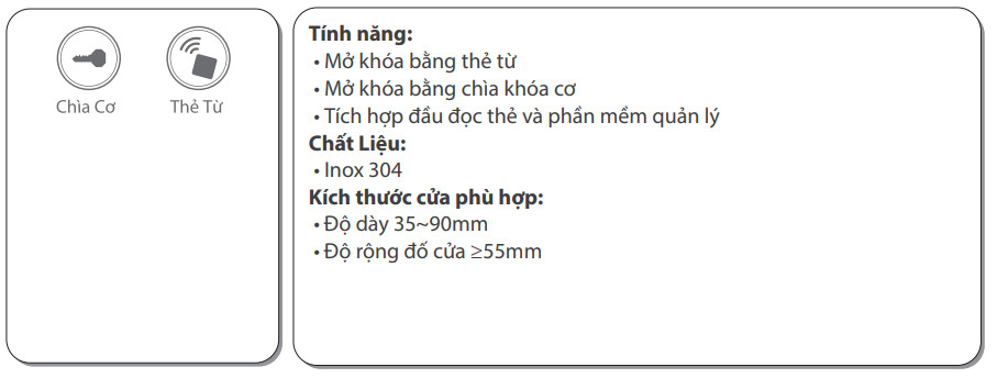 - Dễ dàng sử dụng: cửa sẽ tự động mở sau 1s kể khi thẻ được quẹt vào ô từ trên bề mặt khóa.