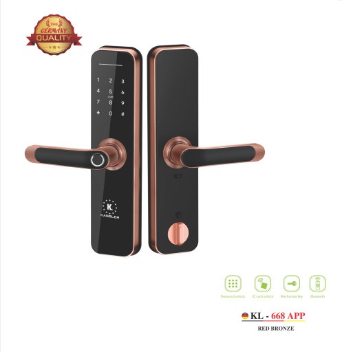 Khóa vân tay Kassler KL-668 RED BRONZE APP TTLOCK BLUETOOTH là dòng sản phẩm đến từ thương hiệu khóa điện tử của Đức, nằm trong bộ sưu tập khóa KL-68 RED BRONZE ,sản xuất trên dây chuyền công nghệ Malaysia, đạt tiêu chuẩn về chất lượng hứa hẹn mang đến nhiều trải nghiệm thú vị cho khách hàng.