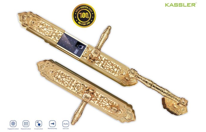 Khóa vân tay Kassler KL-999- Mạ vàng 24k được thiết kế với đường nét hoa văn tinh tế, vừa mang tính cổ điển, vừa mang tính hiện đại, rất ít có sản phẩm nào thu hút khách hàng từ cái nhìn đầu tiên như Khóa vân tay Kassler KL-999- Mạ vàng 24k.