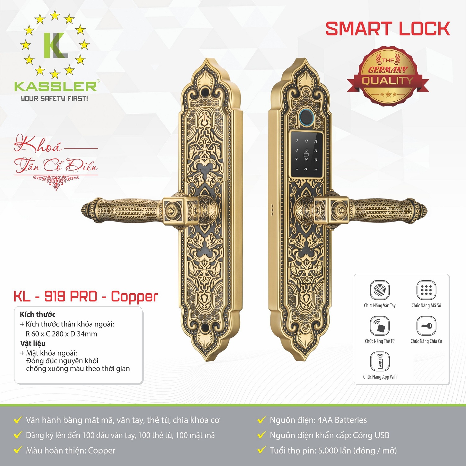Khóa vân tay tân cổ điển Kassler KL-919 PRO APP là dòng khóa cửa thông minh dành riêng cho các tín đồ yêu thích vẻ đẹp tân cổ hiện đại và sang trọng. Kassler Việt Nam cung cấp khóa tân cổ Kassler KL-919 PRO APP chính hãng từ nhà sản xuất, chúng tôi là nhà phân phối duy nhất tại Việt Nam, hứa hẹn mang lại cho khách hàng dịch vụ tốt nhất.