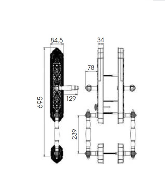 + Kích thước thân khóa ngoài: R84,5 x C710 x D34 mm