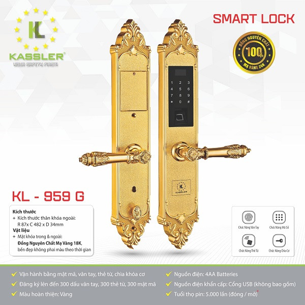 Khóa vân tay tân cổ Kassler KL-959G là dòng khóa cửa thông minh dành riêng cho các tín đồ yêu thích vẻ đẹp tân cổ hiện đại và sang trọng. Kassler Việt Nam cung cấp khóa tân cổ Kassler KL-959G chính hãng từ nhà sản xuất, chúng tôi là nhà phân phối duy nhất tại Việt Nam, hứa hẹn mang lại cho khách hàng dịch vụ tốt nhất.