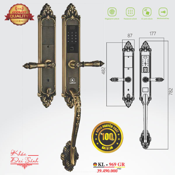 Khóa vân tay tân cổ Kassler KL-969GR là dòng khóa cửa thông minh dành riêng cho các tín đồ yêu thích vẻ đẹp tân cổ hiện đại và sang trọng. Kassler Việt Nam cung cấp khóa tân cổ Kassler KL-969GR chính hãng từ nhà sản xuất, chúng tôi là nhà phân phối duy nhất tại Việt Nam, hứa hẹn mang lại cho khách hàng dịch vụ tốt nhất.